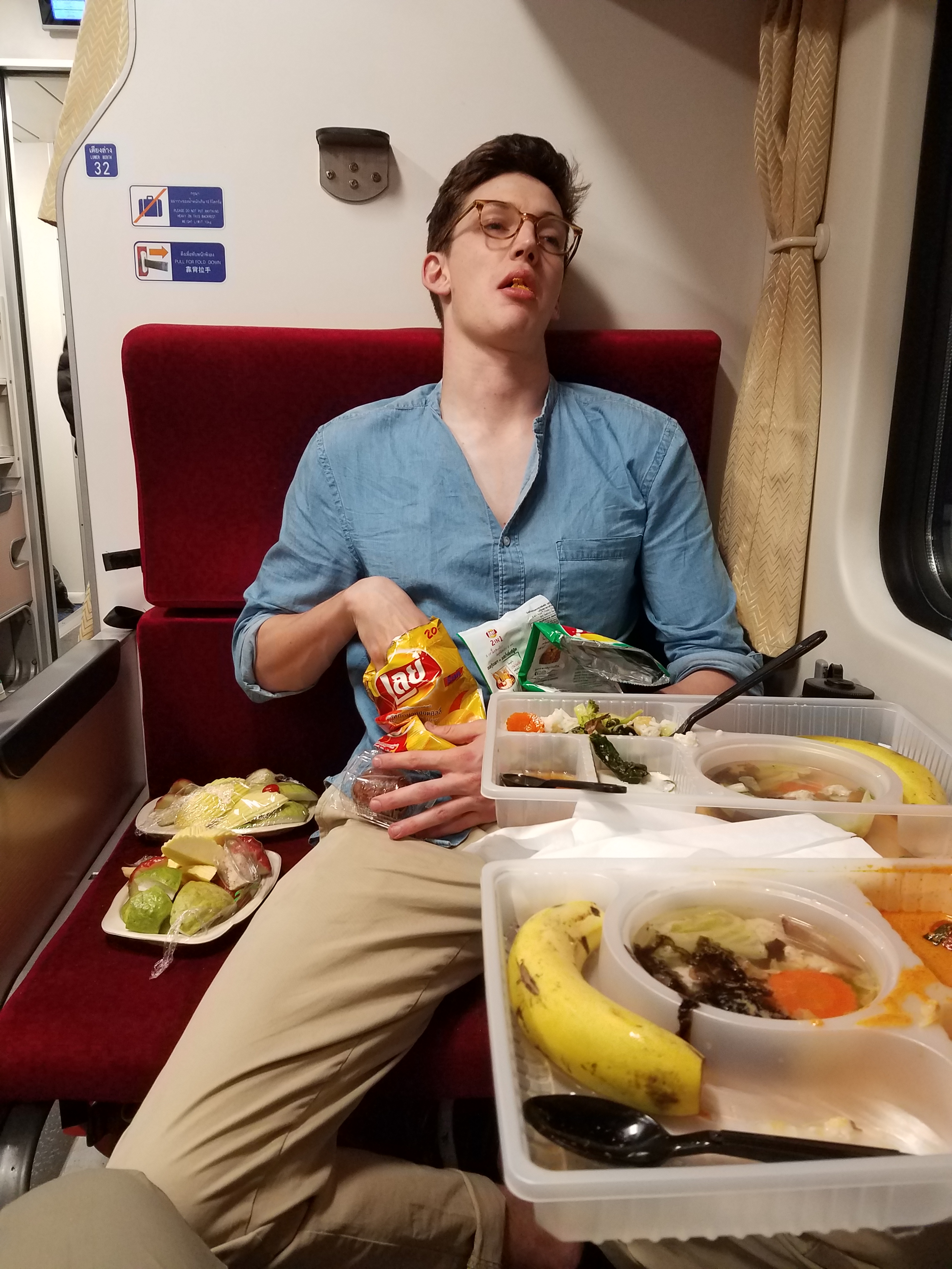 Later on, stuffed to the brim, we debated cracking open some liquor we bought earlier and play a card game. Hey we were on vacation give us a break. However, there was a no alcohol policy. So it was a risk. We liked living dangerously. Every time we were about to pull out the bottle, someone would walk by and we would have to quickly pull it away. We started to debate if it was even worth the hassle, then a security guard walked up to us. We all froze and stared at him. How did he know? Someone must have ratted us out. My mind was racing. would we be kicked off the train? How would we get to Chang Mai in the middle of the night? Or worse, would we be arrested?