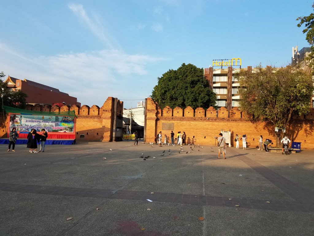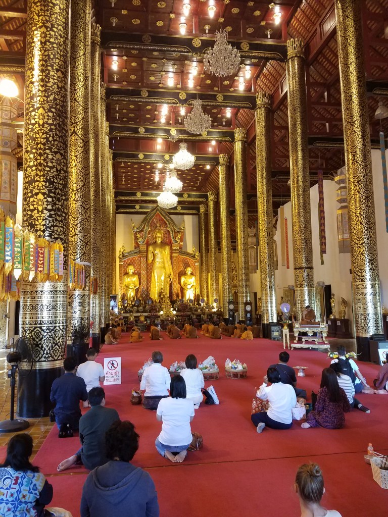 This ride was no different. I was pleasantly surprised by the lack of crowds and tall buildings. Chang Mai had a small town, friendly feel. I wasn’t afraid of being pick-pocketed or scammed. After a short ride we were at the hotel/hostel, where we were told our room wasn’t ready. So we set off on foot to explore the city. Our hotel was just a few blocks outside the “Old City”. The Old City was surrounded by a stone wall and had a large cobblestone courtyard in front of the entrance. Upon entrance, we found many temples and shops setting up for the day. The first temple we stumbled into was filled with monks who were actively praying. Our shorts, backpacks, and wrinkled shirts attracted some awkward glares.