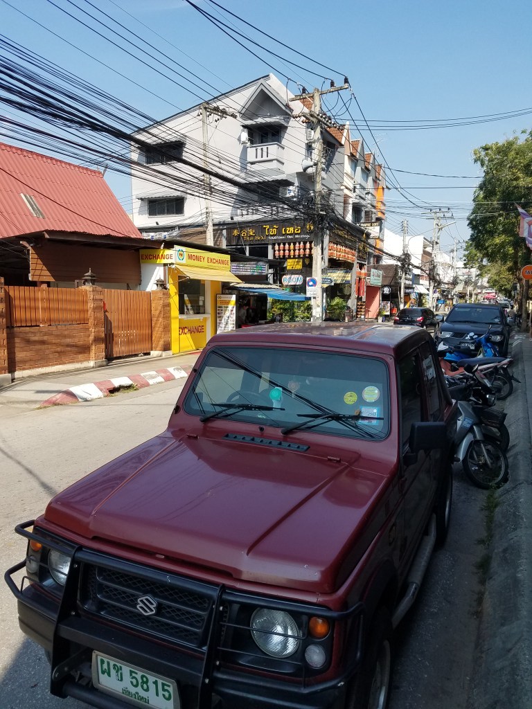 The train arrived in Chang Mai early. It was a foggy morning, so there wasn’t much of a view on the way in. We rumbled into an old train station and offloaded with all our fellow passengers. We had arranged a cab to pick us up around the time the train arrived. Instead we were greeted by what seemed to be a covered pickup truck with bench seating in the bed. I always enjoy the ride into a new city. Assuming you don’t rent a car, you don’t have to worry about the stress of navigation so you’re free to stare out the window. You aren’t on a tour taking the scenic route either. So the ride is filled with local streets and shops and people. Good or bad, it always leaves a lasting impression.