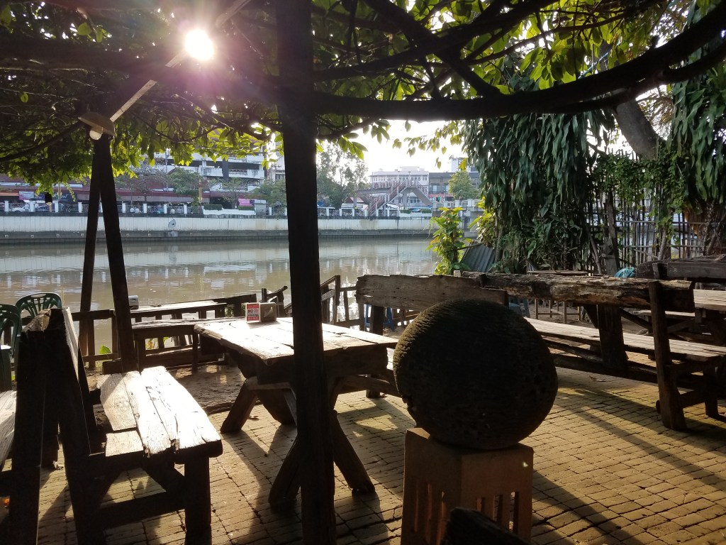 This turned out to be my favorite restaurant of the entire trip. She led us through the shop out back to a small outdoor area that was surrounded by dense foliage. Thick hedges were on either side, vines grew across wooden planks above us, and the Chang Mai river flowed in front of us. There weren’t many people there so it was a quiet and serene dining experience. We were lucky enough to arrive right before sunset. The ripples in the river reflected a kaleidoscope of light while the vines above us gently filtered the golden rays. It was very romantic… for my roommates and I.