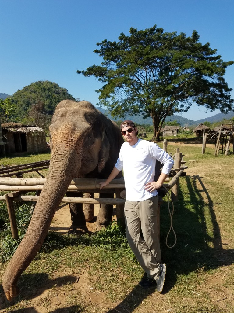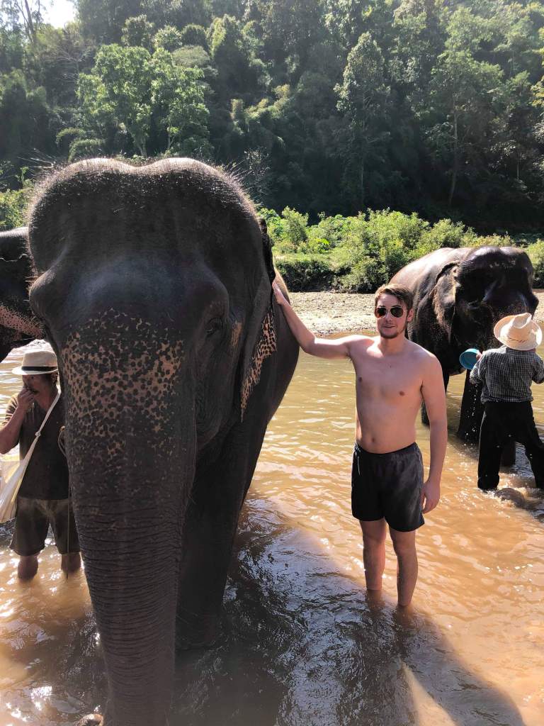 We then had the great honor of bathing the elephants in the river, which was just throwing buckets of water on them. The elephants also relieved themselves (number one and two) in the river and sprayed us with water with their trunks. My immune system really did me a solid that day. I didn’t care too much. It was nice to be out in the sun in swim trunks. I was enjoying it, as you can see: