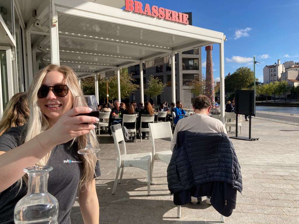 It was the middle of the day, and we had to meet Trent at his office to get the keys to his apartment. We decided just to have lunch at the restaurant underneath him while we were there. It was a bright, sunny day. We sat outside at a little table overlooking one of the canals. We heard no English being spoken. Our waitress was so over-the-top welcoming like she was thrilled to see us. Her English wasn’t great, but that did not curb her enthusiasm. My French is non-existent, so she helped us a lot with the menu, going over her personal favorites.