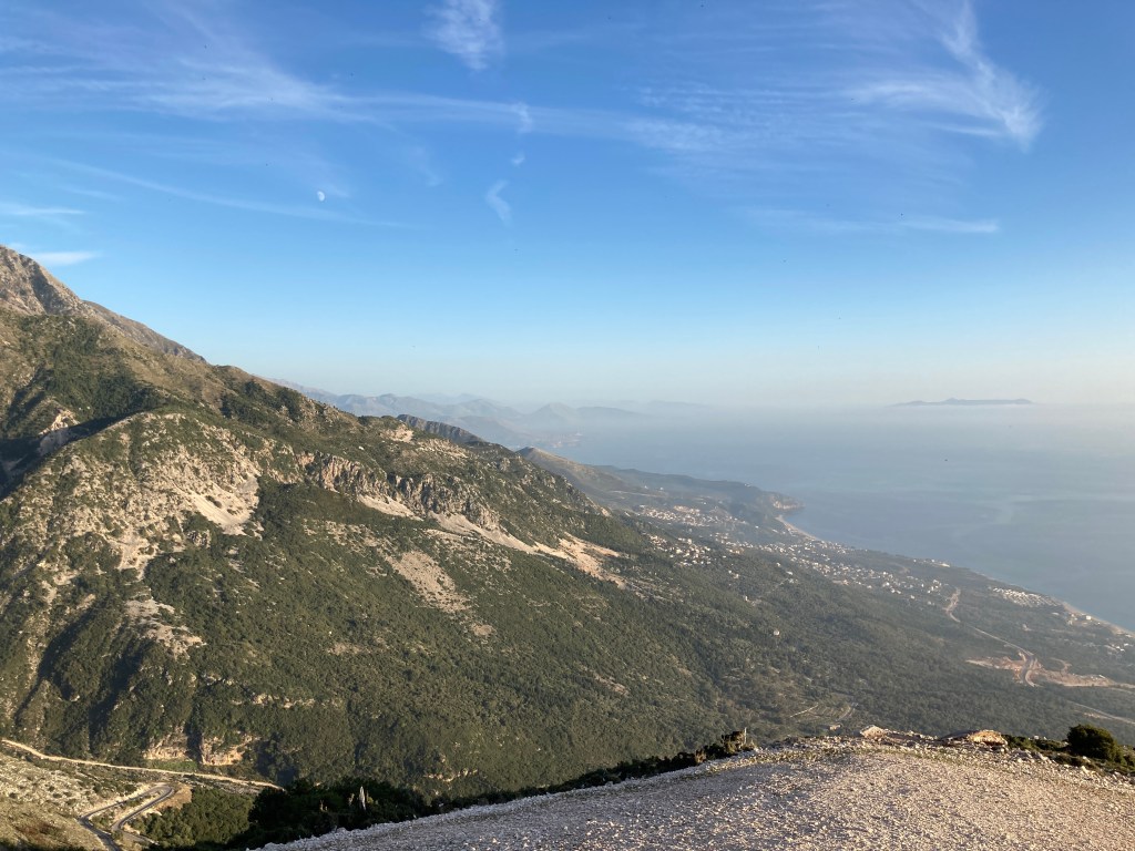 Eventually the road turned to switchbacks in a mountain pass. Small cottages and diners sat in the hills along the way. After three or four hours from our lunch spot, we finally reached the peak of the mountain. To our right was the marvelous Mediterranean, to our left were the brilliant peaks of Albania, and below us ran the coastline into infinity (or eventually Greece). The road wound back down steeply to a town in the distance. The sun was low on the horizon and the world was enveloped in a warm glow.