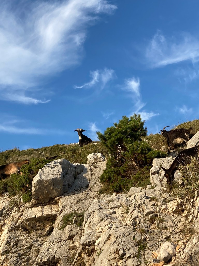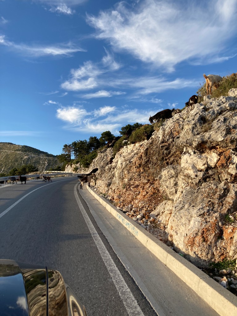Near the top of this steep pass was a small parking area with a viewpoint, where we observed all of this. While we drank in this view, we heard the clanging of cowbells. Faint at first, but they grew louder and grew in number. Behind us, coming over a lip in the hill was a herd of goats. There must have been two or three hundred. They baah-ed and whined and groaned as they slowly took over the entire road, blocking our way back. Among them was a single shepherd. Or herder. One guy ushering them. We had to shoo some goats away to even get back in the car. It seemed an improbable path for them. Surely there was a better way through than literally up and over the entire mountain. But I know little of goat herding, so I just watched the spectacle with no further questions.