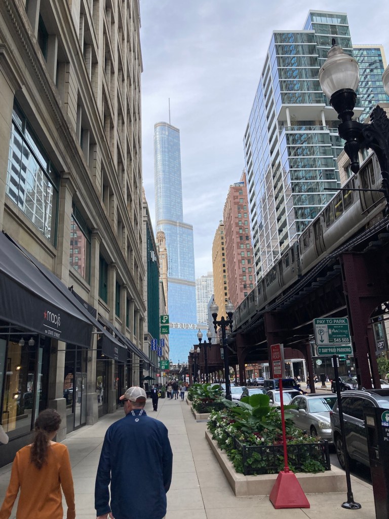 Speaking of Spiderman, the original movies filmed in Chicago several times, featuring shots of the “L” train. No research required for that one, just a core-memory factoid that probably took the space in my brain that was needed to know how to spell orderves. Chicago has a great balance of old and new, rustic and pristine. The “L” train serves as useful public transportation for the city, but the faded iron beams holding it and the screech of the wheels on the tracks also make it feel like a relic. Then there are new things like the riverwalk that add to a modernizing city.