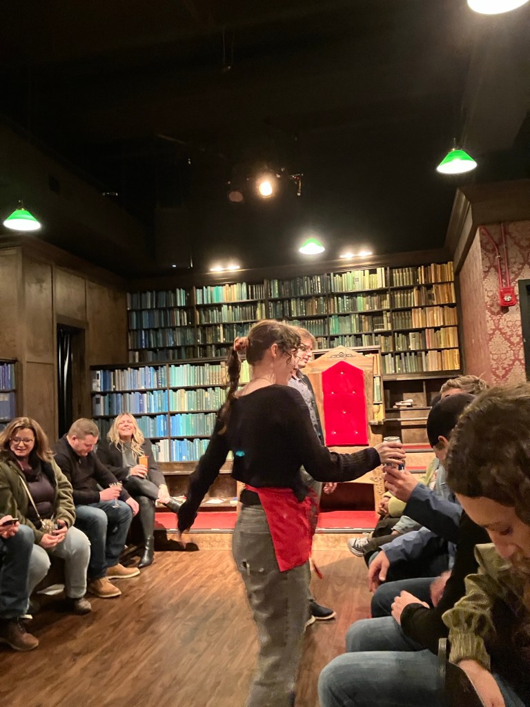 A good segue into this would be something my sister took me to called Drunken Shakespeare. In a little room downtown, decorated as a library, a group of five actors perform a Shakespeare play inches away from your feet. They run up and down the stage, they dramatically deliver olde English monologues, and one of them gets drunk. This one actor is randomly selected at the beginning to take 4-5 shots, along with more throughout the play. They still deliver their lines, but many things about the play can be changed. For example, the drunk actor told the narrator he must do an impression for every narration. As the actor gets more belligerent, the show gets funnier, or at least more unhinged.